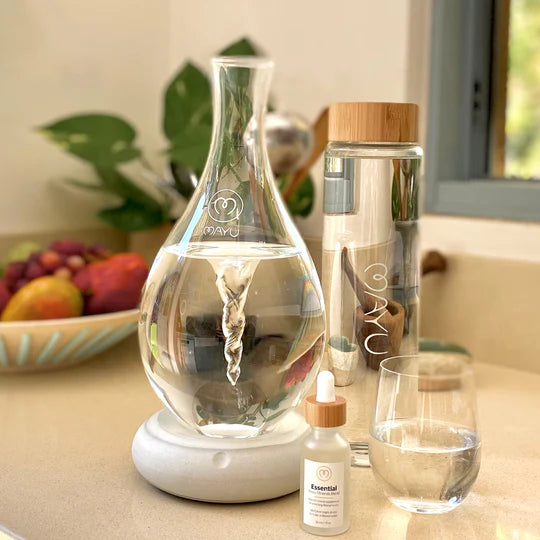Wasser in der Natur bewegt sich in einer spiralförmigen, wellenförmigen Strömung und nimmt dabei Sauerstoff auf. Wenn es jedoch in geraden, geschlossenen Rohren festsitzt, verliert es seine Fähigkeit, frisch zu bleiben. MAYU Swirl hilft Ihrem Wasser, mit einer sanften Whirlpool-Bewegung, die Sauerstoff anzieht und gleichzeitig die Alkalität ausgleicht, wieder in Schwung zu kommen, um seinen idealen Geschmack und seine ideale Textur zu entfalten.